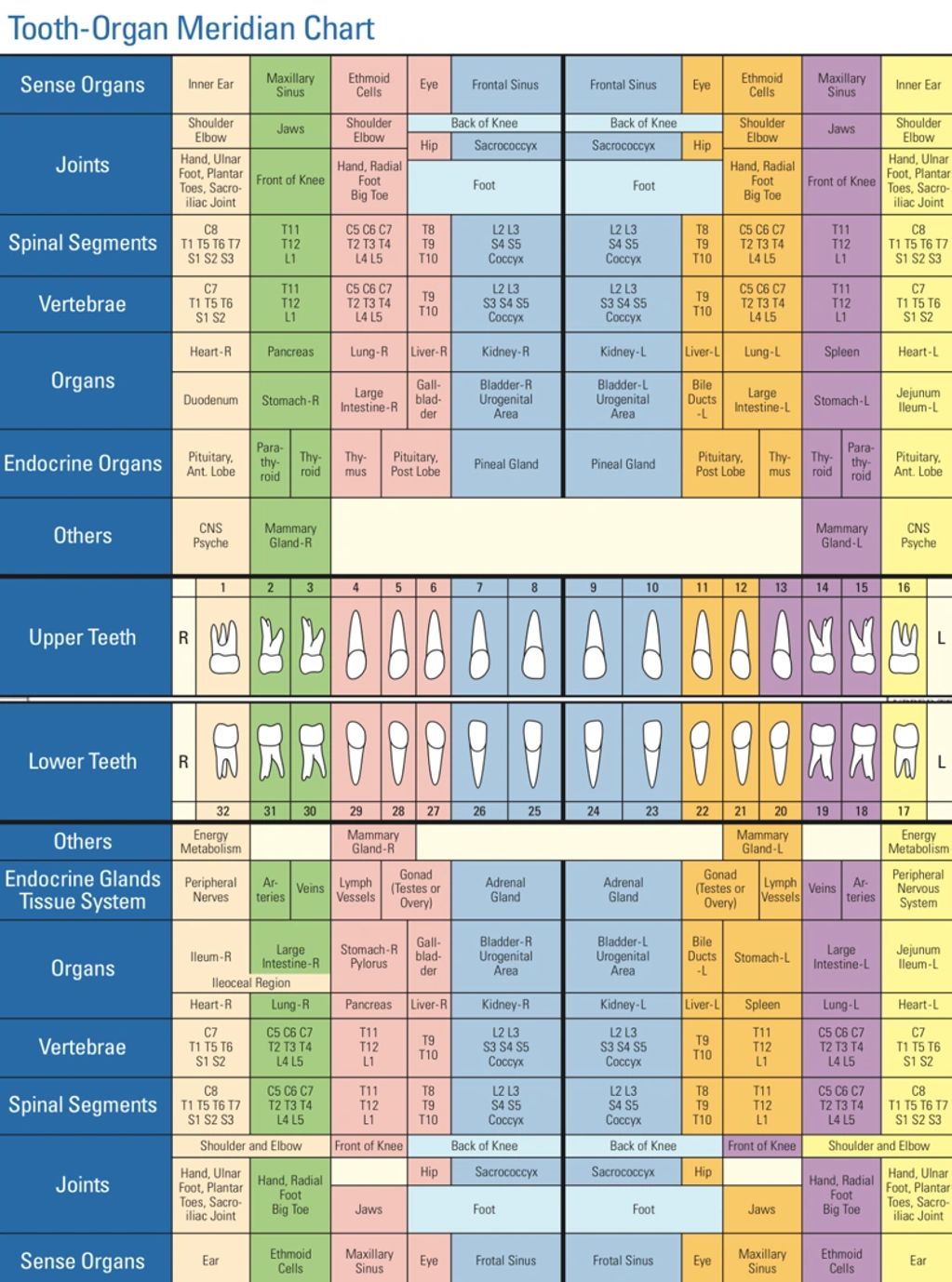 The Meridian tooth chart is based on acupuncture meridians, pathways of energy that span across interrelated body parts, glands, and tissues. Each tooth is associated with a particular meridian, through which energy flow. The Meridian tooth chart shows the whole tooth and body connection.
